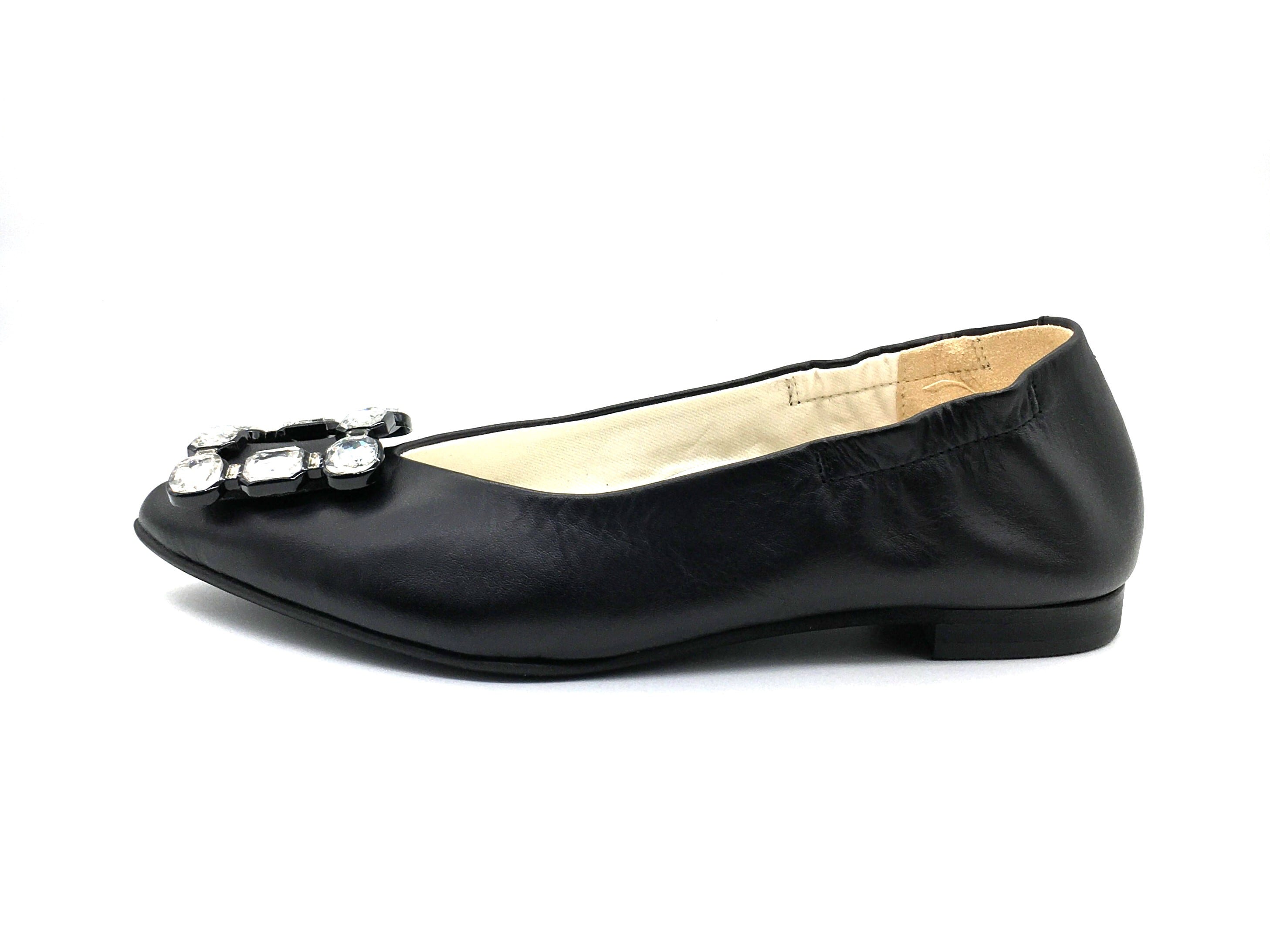 ビッグサイズのモードなビジュー飾りを載せた、華やかな一足。